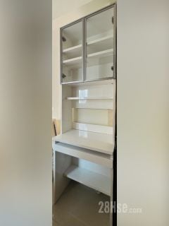 亮面材质 十分易于打扫清洁 隔板可自由调较层数和高度 玻璃柜门清晰可见 方便取物 枱面下拉出层板即可为键盘作承载 里面同时有隐藏柜桶可作收纳用途 88成新