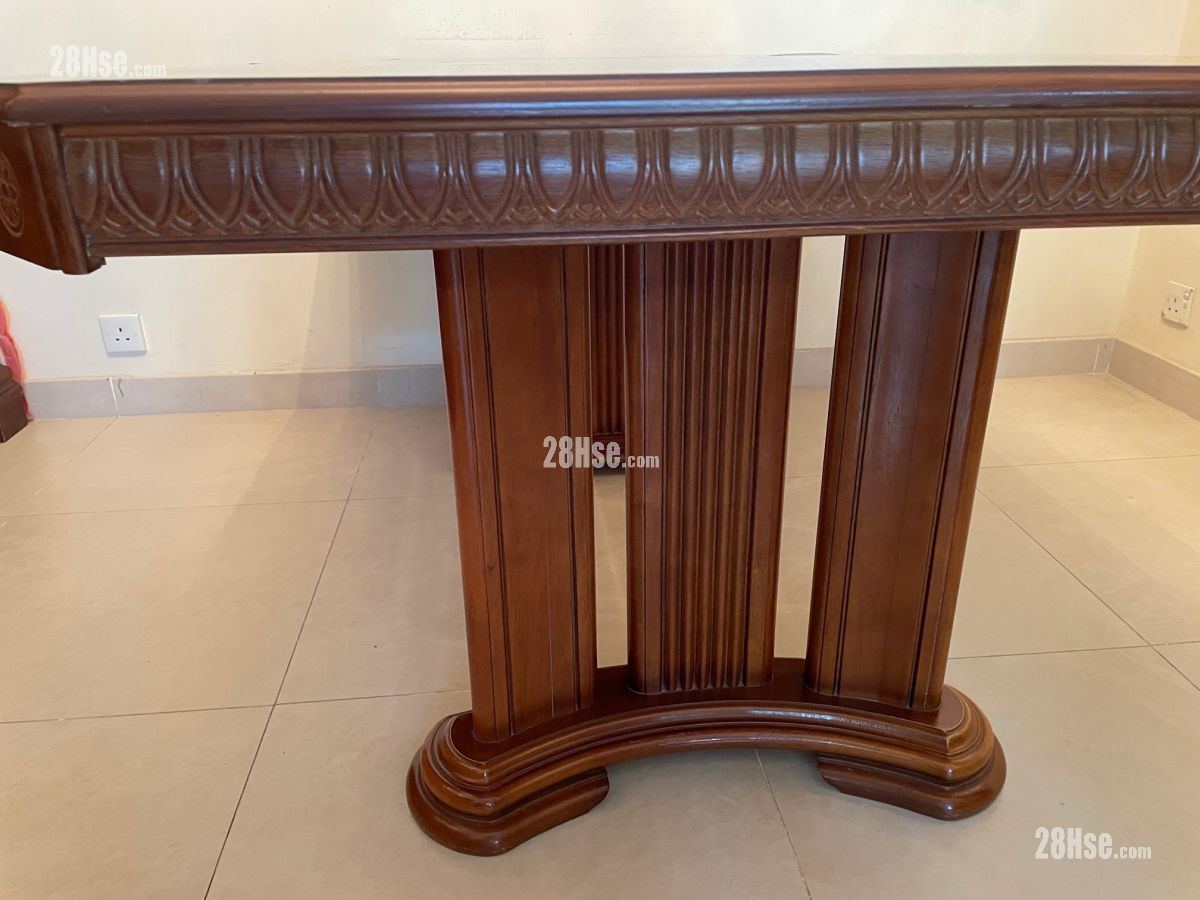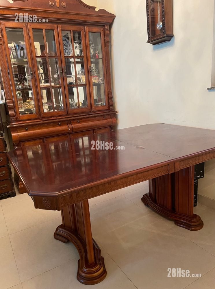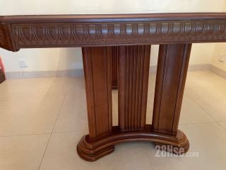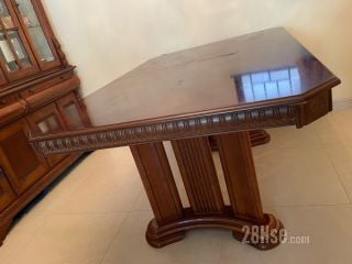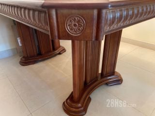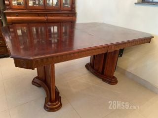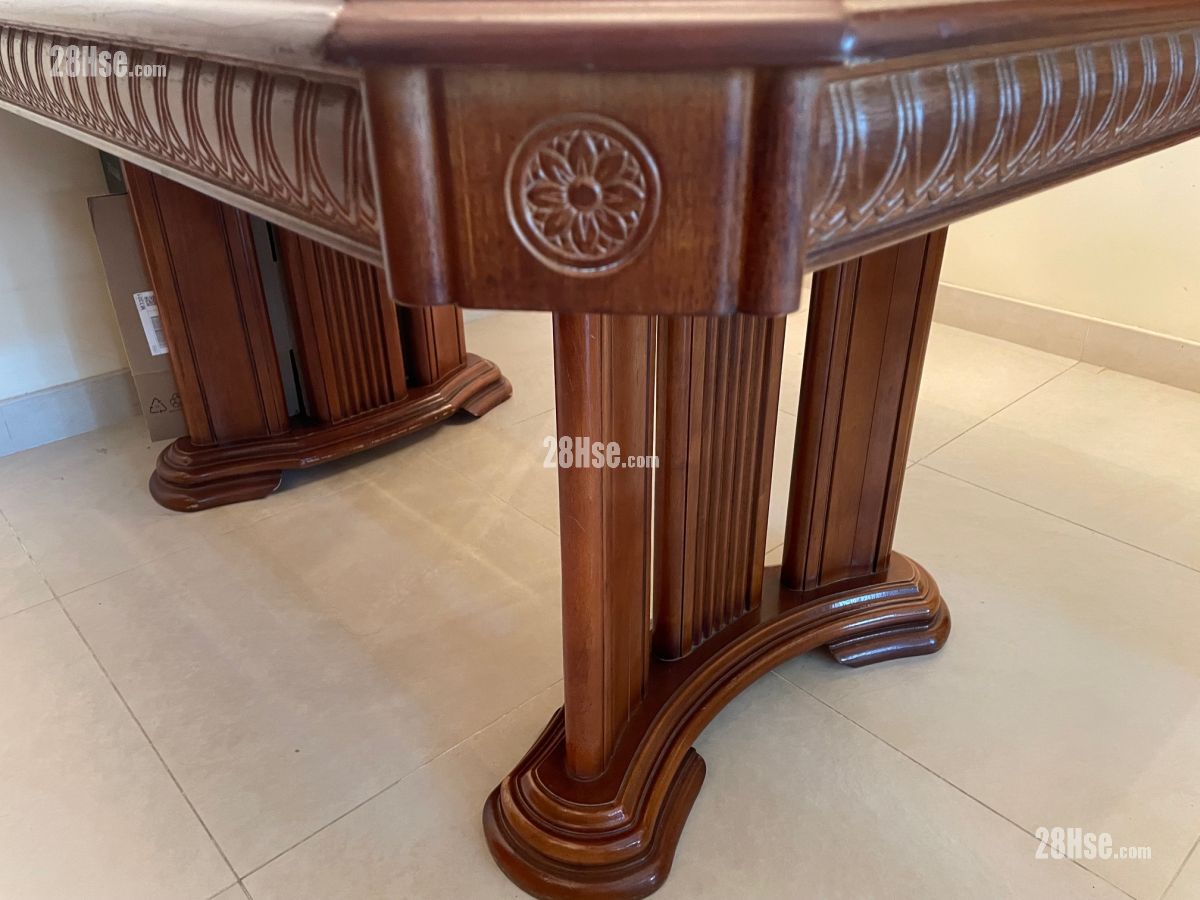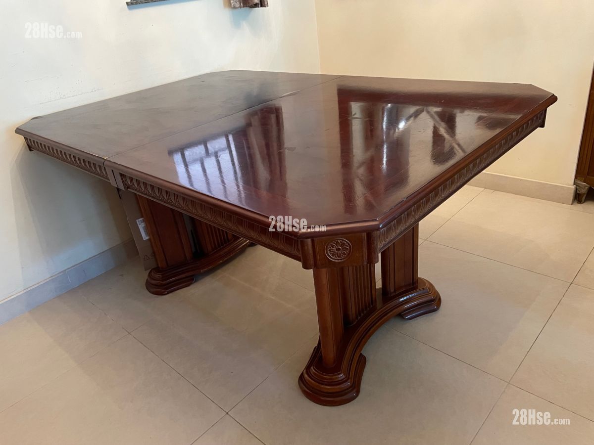 美國名牌Universal 歐陸紅木經典大型餐桌, 163 x 106cm (未擴張) (擴張後約193 x 106cm) , 桌中央可加擴張部分 (可分開收藏). 角位呈八角形, 桌邊精緻雕刻, 桌底也有歐陸雕刻, 實木穩重, 氣派不凡.