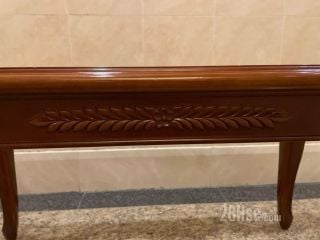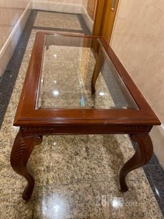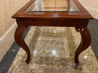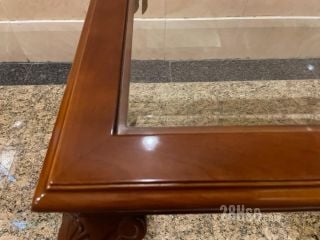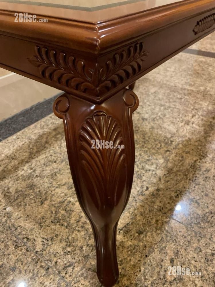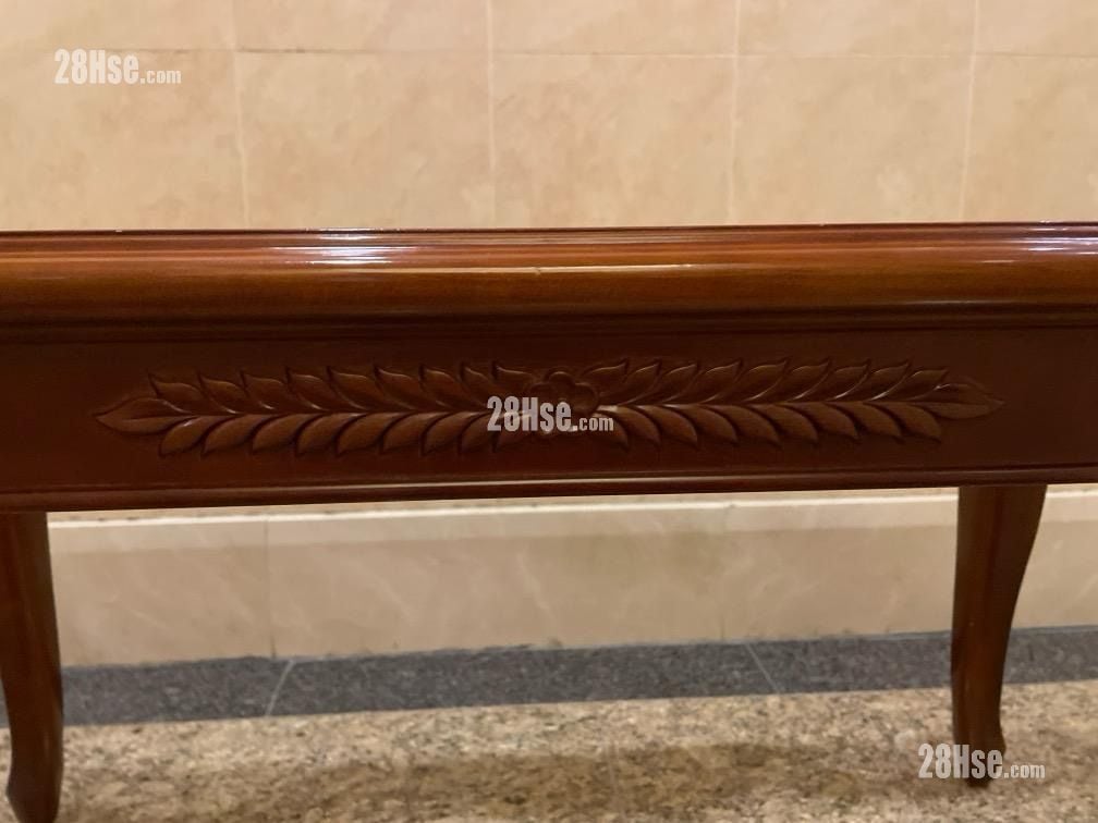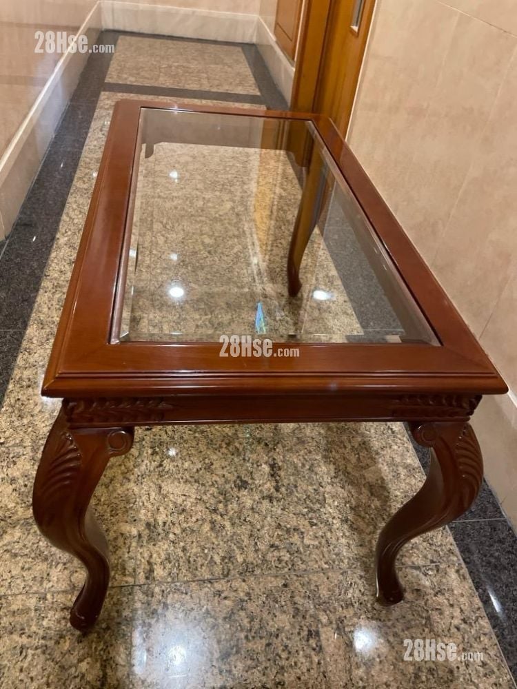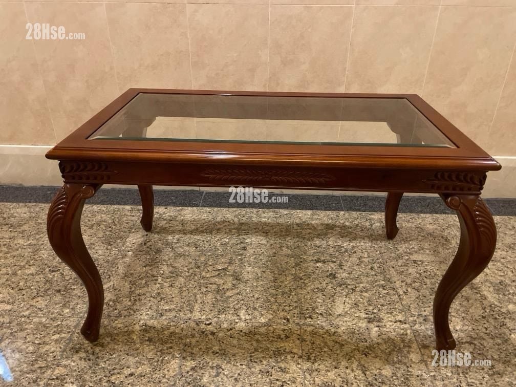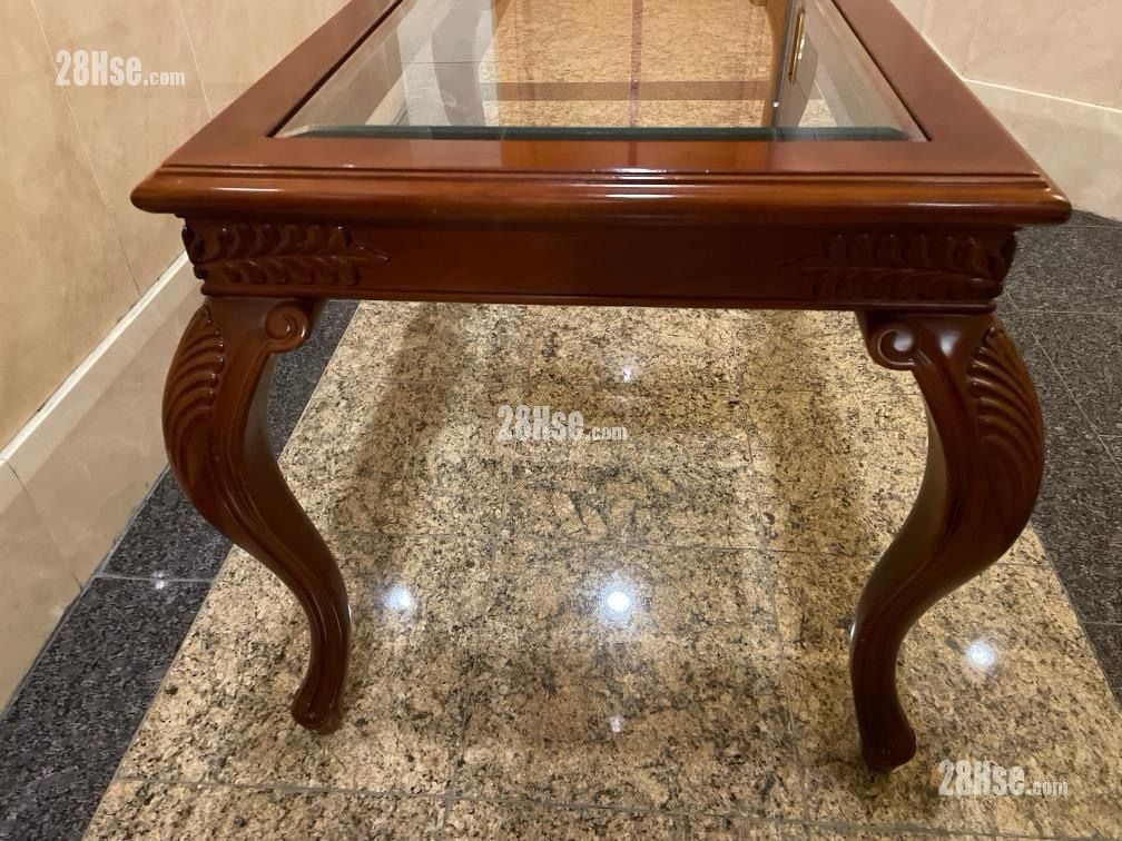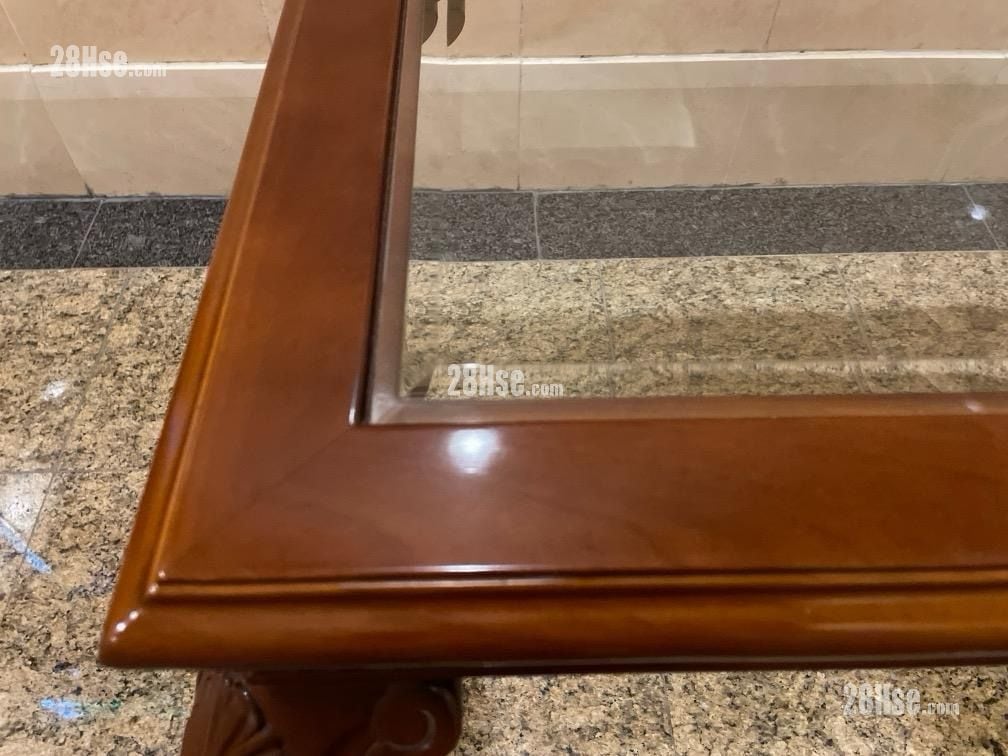 歐陸古典紅木雕花(實木連批花玻璃面及木雕沿邊和腳), 4腳呈弧形, 連精緻雕刻, 茶几沿邊有細緻雕刻. 玻璃面有多面切割, 反射光線, 更具氣派. 90cm 闊 x 50cm 深 x 54cm 高