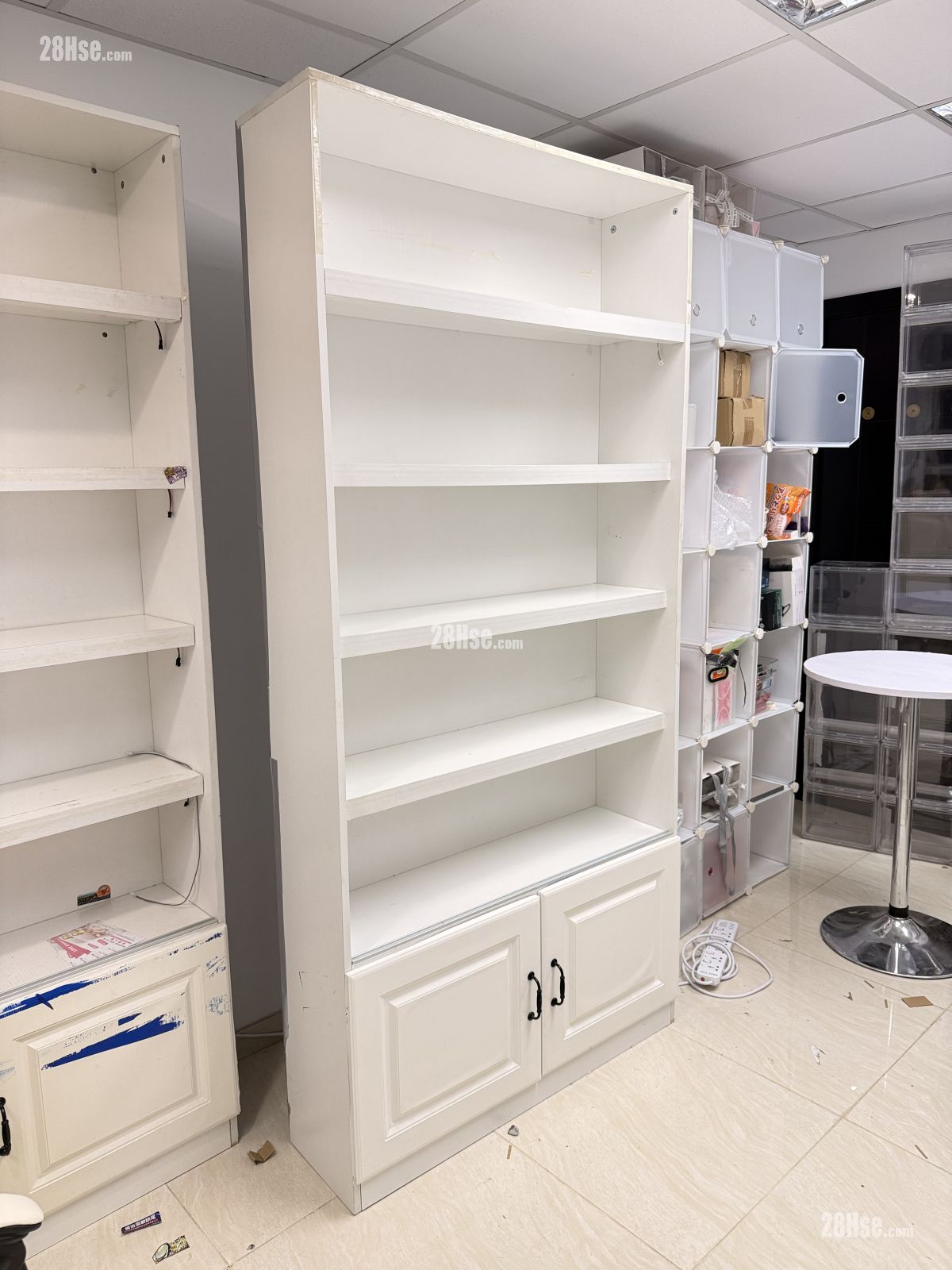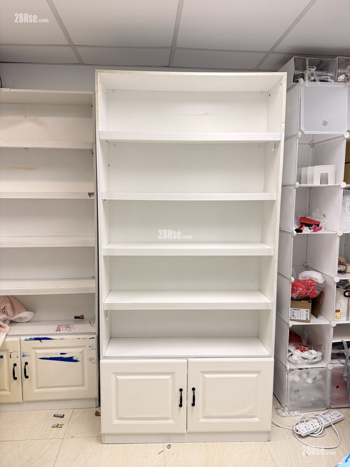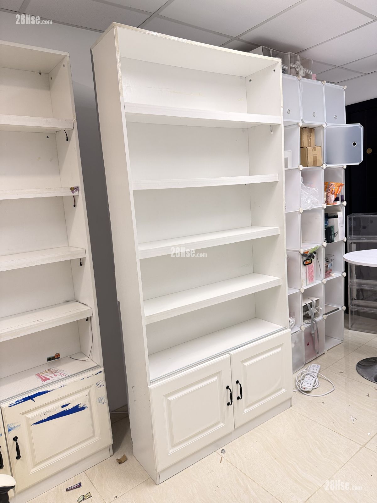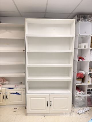 白色儲物櫃,帶有四層架子和底部儲物櫃。儲物櫃的設計簡潔,適合存放書籍、裝飾品或其他物品。儲物櫃的門上有黑色把手。儲物櫃的尺寸適合各種空間,提供額外的儲存空間。