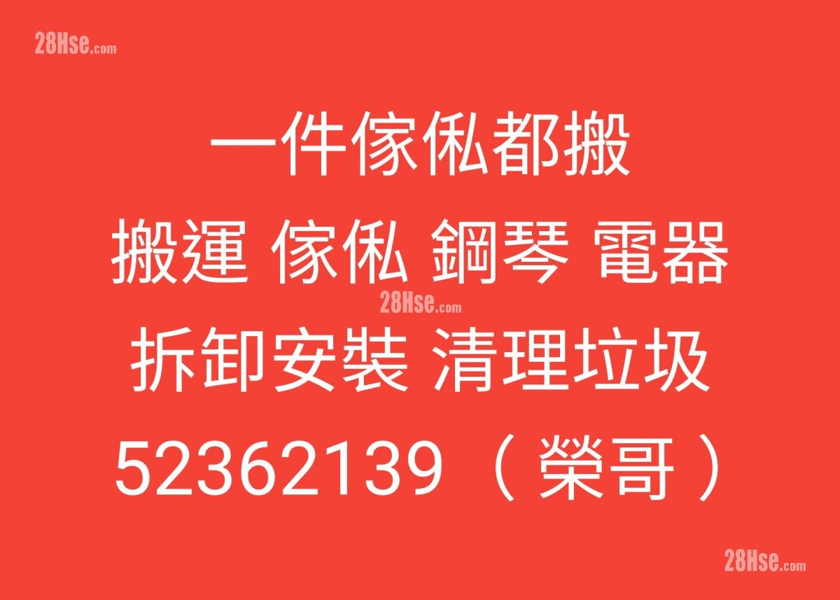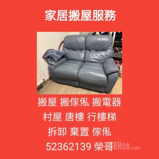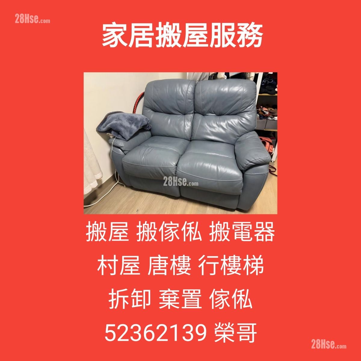 家居搬屋服務, 村屋,唐樓,行樓梯。 搬運、 拆卸、安裝傢俬,電器。 棄置傢俬,清理垃圾。